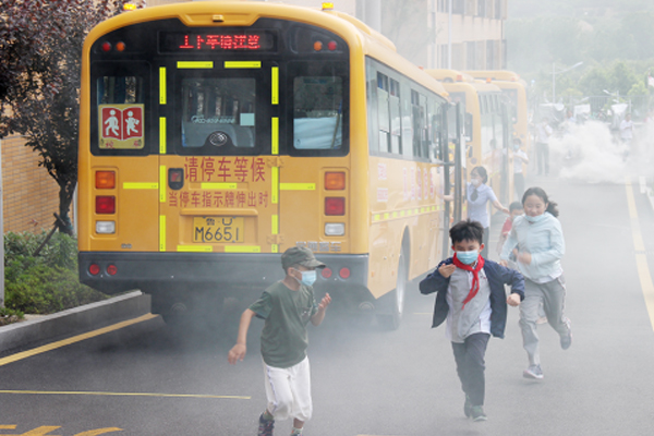 04:20分,随着一声哨响,烟雾弹点燃,整个校车停放处浓烟四起,刚刚测温上了校车的学生,在校车司乘人员的组织下,快速从校车上跳下,沿着规定的撤离线路,有序撤离到学校操场的安全地带,用时不到一分钟,撤离速度达到了预期的效果。
